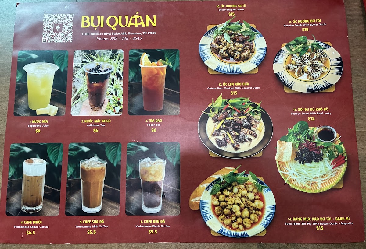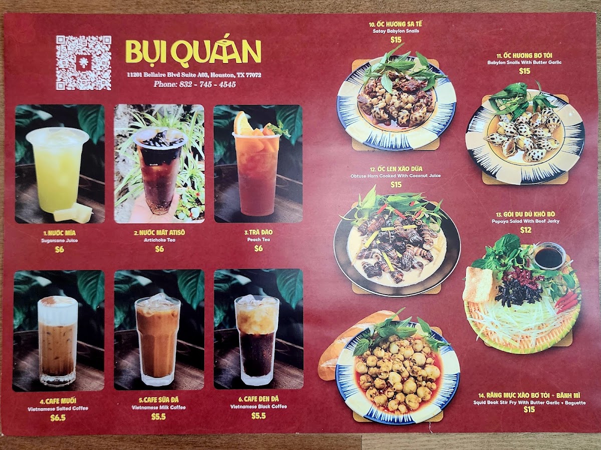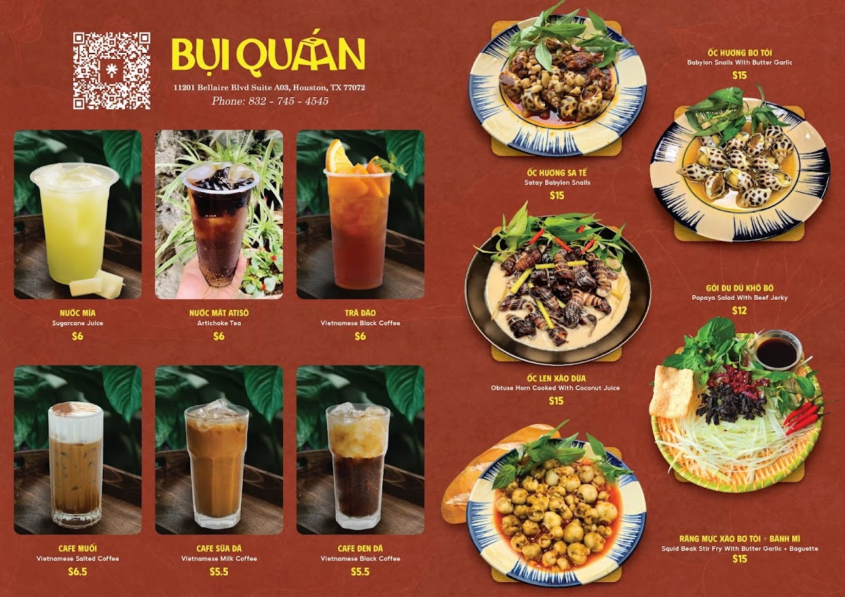 Visitors can expect highlights like Bún Bò Huế, a richly layered noodle soup perfect for any time of day, alongside lighter bites such as the papaya salad with beef jerky or the uniquely seasoned satay Babylon snails. Refreshing drinks like Vietnamese salted coffee and a bright, sweet nuoc mia (sugarcane juice) complement these dishes and help round out the experience.